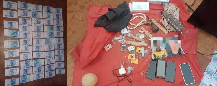 Cette descente a permis de saisir une somme de cinq cent trente mille (530 000) francs CFA de faux billets, deux motos Honda Wave, un portefeuille dit magique, des plaquettes de carte sim, des statuettes et d’autres objets utilisés pour le fétichisme.