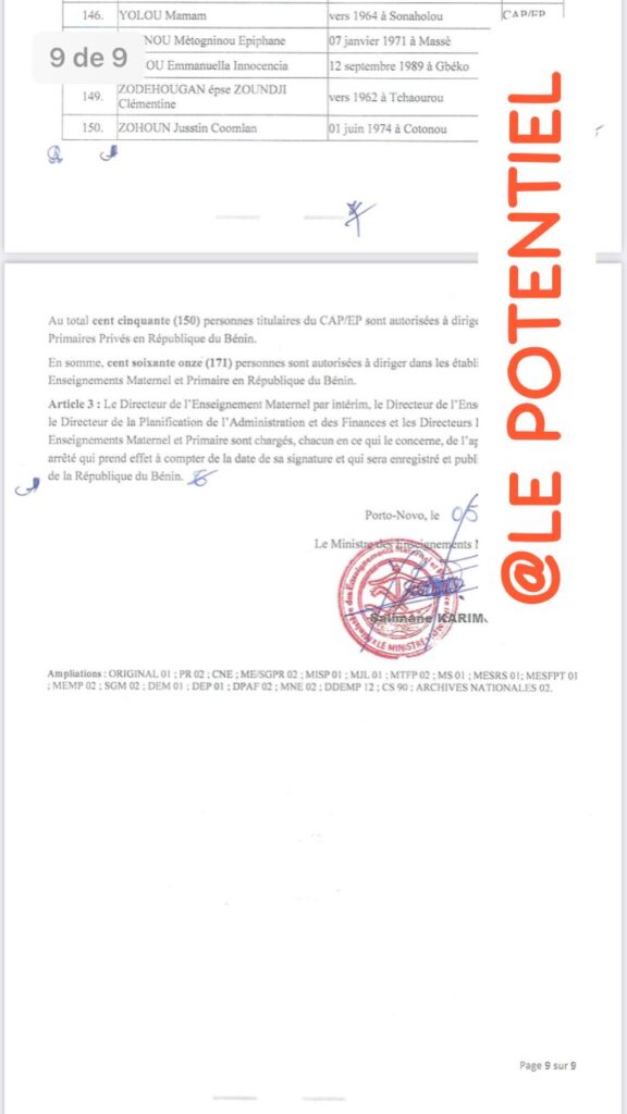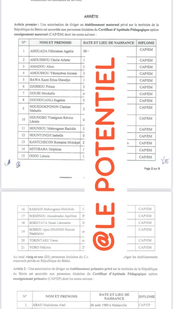 Éducation au Bénin : Liste des 171 éducateurs autorisés à diriger les établissements maternel et primaire