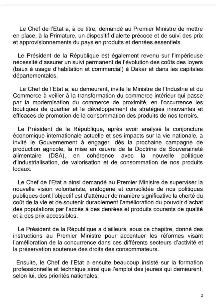 Dans ce cadre le président a demandé au premier ministre Ousmane Sonko d’élaborer un plan d’urgence opérationnel de lutte contre la vie chère. Cela vise à procéder à la baisse des prix de certains produits de première nécessité et des services.