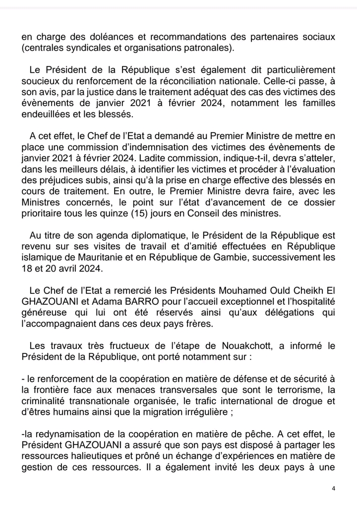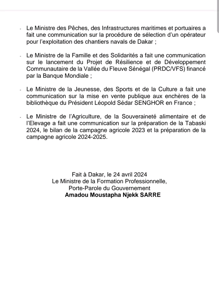Le gouvernement du Président Sénégalais Bassirou Diomaye Faye s’est réuni ce mercredi 24 avril 2024 en conseil des ministres. Cette réunion a permis de prendre une avalanche de décisions en rapport avec plusieurs secteurs pour le bien être des populations.
