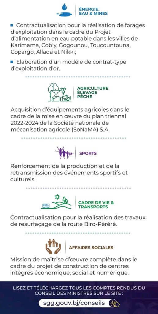 – Contractualisation pour la réalisation de forages d’exploitation dans le cadre du Projet d’alimentation en eau potable dans les villes de Karimama, Cobly, Gogounou, Toucountouna, Copargo, Allada et Nikki ;
