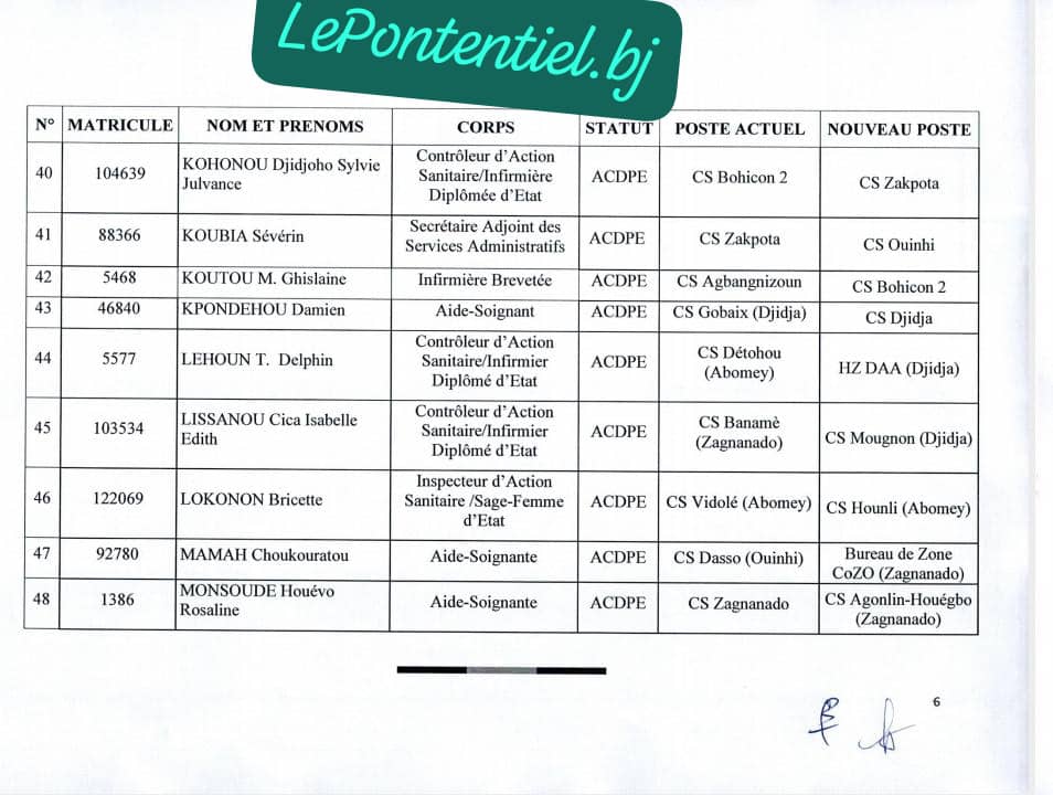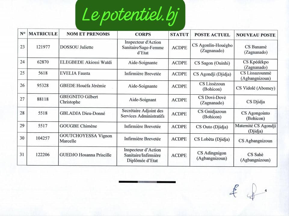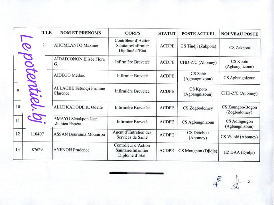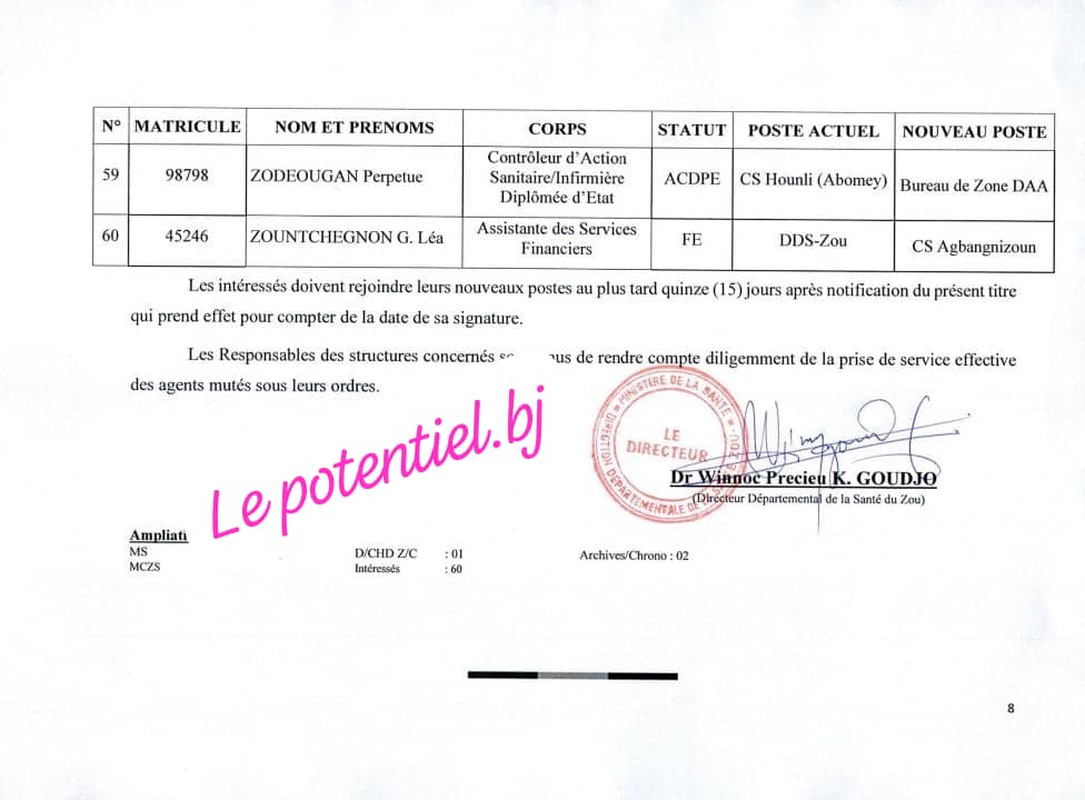 Le Directeur Départemental de la Santé du Zou Dr. Winnoc Precieu Goudjo à travers la décision N°A372/MS/SGM/DDS-ZOU/SPAF/DGRH/SA du mardi 27 août 2024 a procédé à l’affectation de plusieurs agents de santé en service dans son département.