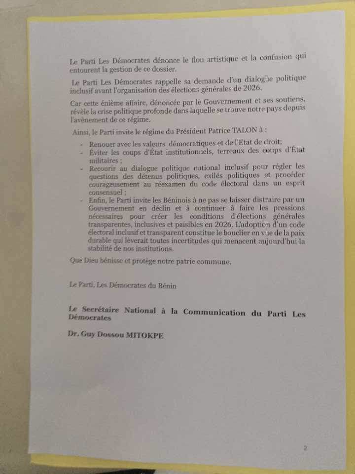 Renouer avec les valeurs démocratiques de l’Etat de droit , Éviter les coups d’Etat institutionnels , terreaux des coups d’état militaires, Recourir au dialogue politique national inclusif pour régler les questions des détenus politiques. Pour finir ,le parti invite les béninois à ne pas se laisser distraire par un gouvernement en déclin et à faire pression nécessaire pour créer des conditions d’élections générale transparente et inclusive.