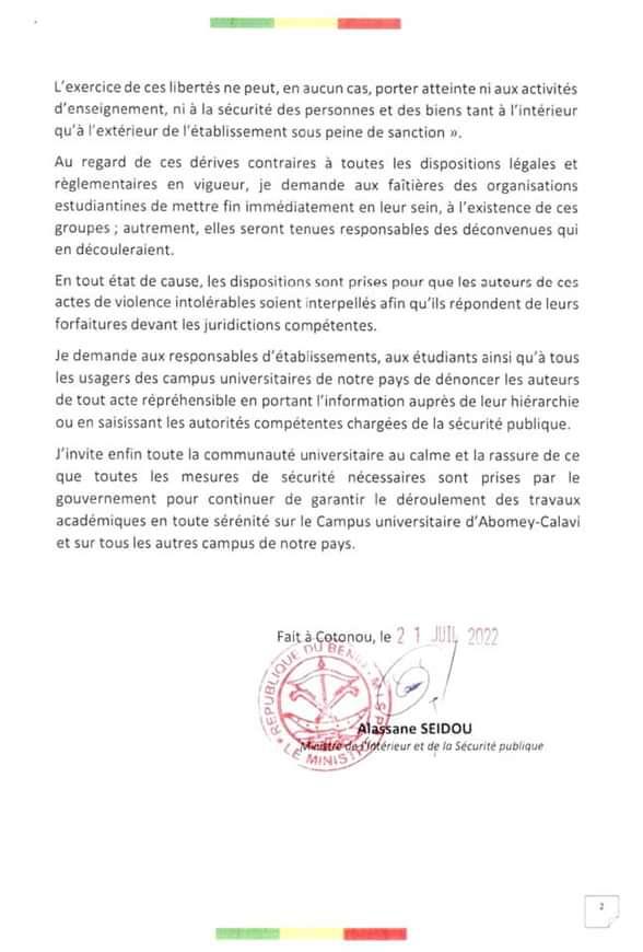 L’Université d’Abomey-Calavi (UAC) est en proie à des tensions croissantes, où l’intimidation entre étudiants semble être devenue la norme. Malgré la dissolution de la « Garde Fédérale » en août 2022, la situation sur le campus reste chaotique et préoccupante. Cette dissolution faisait suite à un communiqué du Ministère de l’Intérieur et de la Sécurité Publique (MISP) en date du jeudi 21 juillet 2024 exigeant la cessation des groupes paramilitaires dans les institutions universitaires. À travers ce communiqué, le ministre Alassane SEIDOU demande aux étudiants et usagers du campus de dénoncer les auteurs de tout acte répréhensible en portant l’information auprès de la hiérarchie ou en saisissant les autorités compétentes chargées de la sécurité publique.