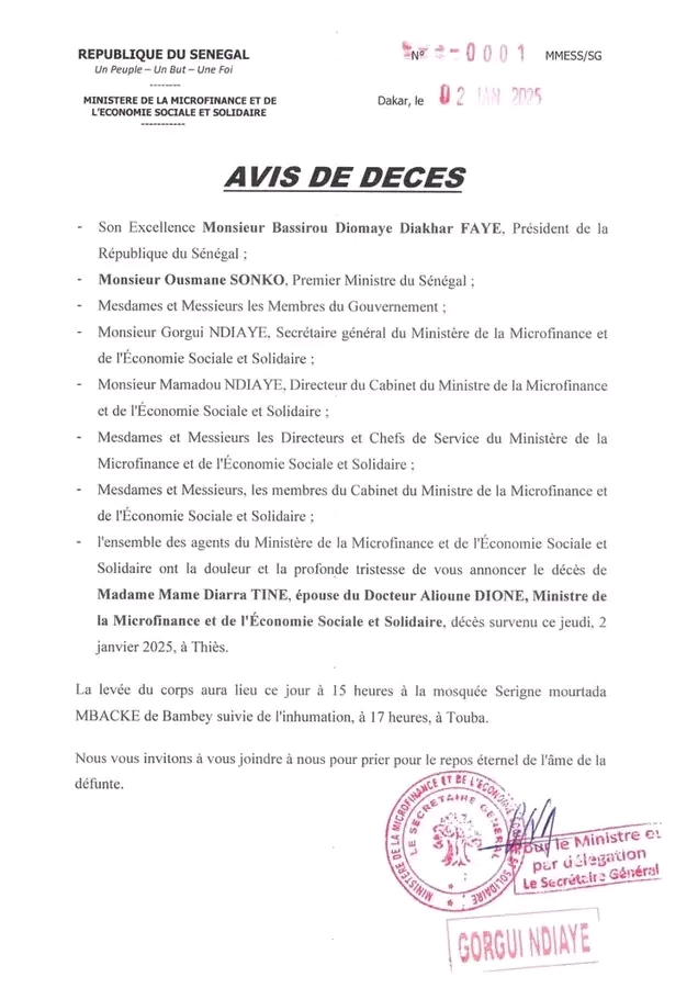 Triste nouvelle au Sénégal. Dr. Alioune Badara Dione Ministre de la Microfinance de l’Économie Sociale et Solidaire du Sénégal a perdu ce jeudi 2 janvier 2025 son épouse Mame Diarra Tine. L’avis de décès a été rendu officiel par le Ministère à travers son Secrétariat Général ce jeudi.