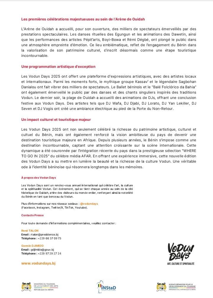Avec plus de 435 000 participants en trois jours, les Vodun Days 2025 qui se sont déroulés les 09, 10 et 11 à Ouidah, au Bénin, établissent un record historique. Entre cérémonies spirituelles, rites traditionnels et expressions artistiques, cet événement, porté par le Président Patrice Talon et son gouvernement célèbre la richesse et la vitalité de la culture Vodun, confirmant la place centrale du Bénin dans la préservation de ce patrimoine immatériel unique.