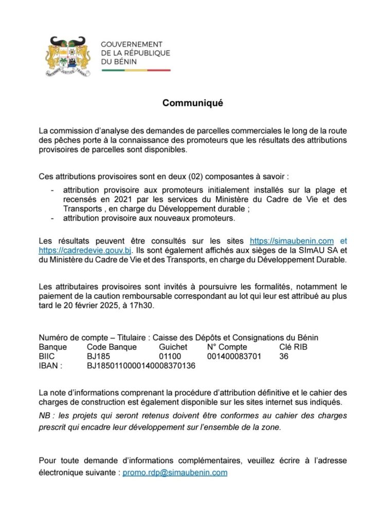 Les résultats des attributions provisoires des parcelles sont désormais disponibles. L’information a été dévoilée à travers un communiqué de la commission d’analyse des demandes du Ministère du cadre de vie et des transports. Les résultats peuvent être consultés sur les sites https://simaubenin.com et https://cadredevie.gouv.bj. Les attributaires provisoires sont invités à poursuivre les formalités du paiement de la caution remboursable correspond au lot qui leur a été attribué au plus tard le 20 février prochain.