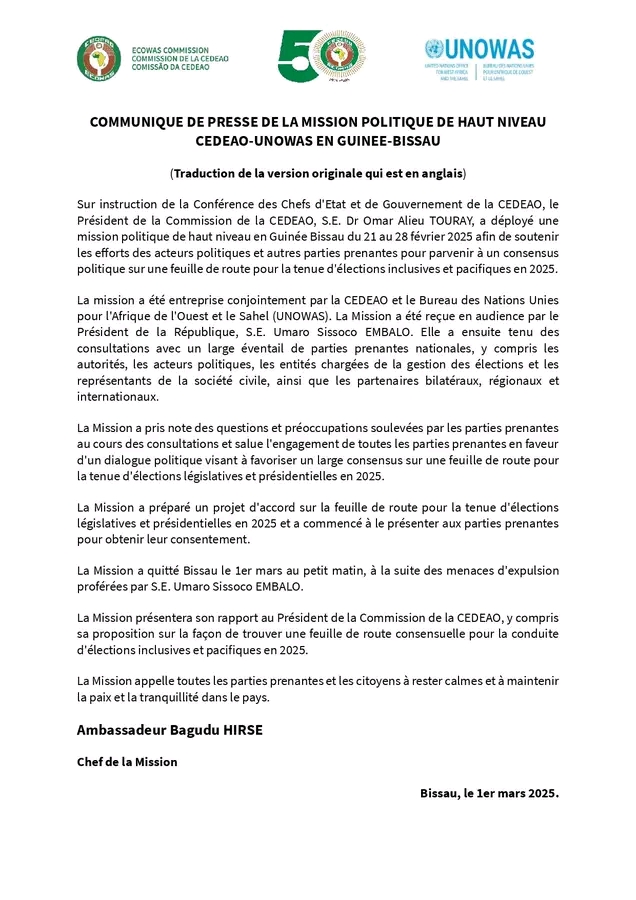 Déployée pour faciliter un consensus sur l’organisation des élections de 2025, la mission politique de la CEDEAO et de l’UNOWAS a dû quitter la Guinée-Bissau en urgence le 1er mars. En cause, des menaces d’expulsion proférées par le président Umaro Sissoco Embaló.