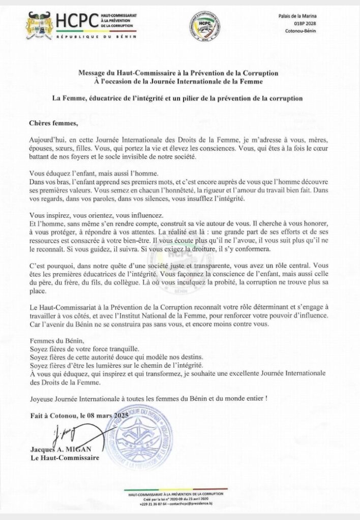 Chaque année, le 8 mars marque la célébration de la Journée internationale des droits des femmes. À l’occasion de l’édition 2025, le Haut-Commissaire à la Prévention de la Corruption a adressé un message aux femmes, mettant en lumière leur rôle essentiel dans la lutte contre la corruption. « La femme, éducatrice de l’intégrité et pilier de la prévention contre la corruption », a déclaré Jacques Migan, Haut-Commissaire à la Prévention de la Corruption.