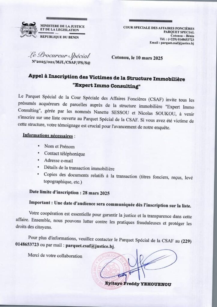 Par un communiqué officiel N°2025/021/MJL/CSAF/PS/S@, en date du lundi 10 mars 2025, le Procureur Spécial de la Cour Spéciale des Affaires Foncières (CSAF) appelle toutes les victimes de la société immobilière « Expert Immo Consulting » à s’inscrire pour faciliter le traitement judiciaire de l’affaire.