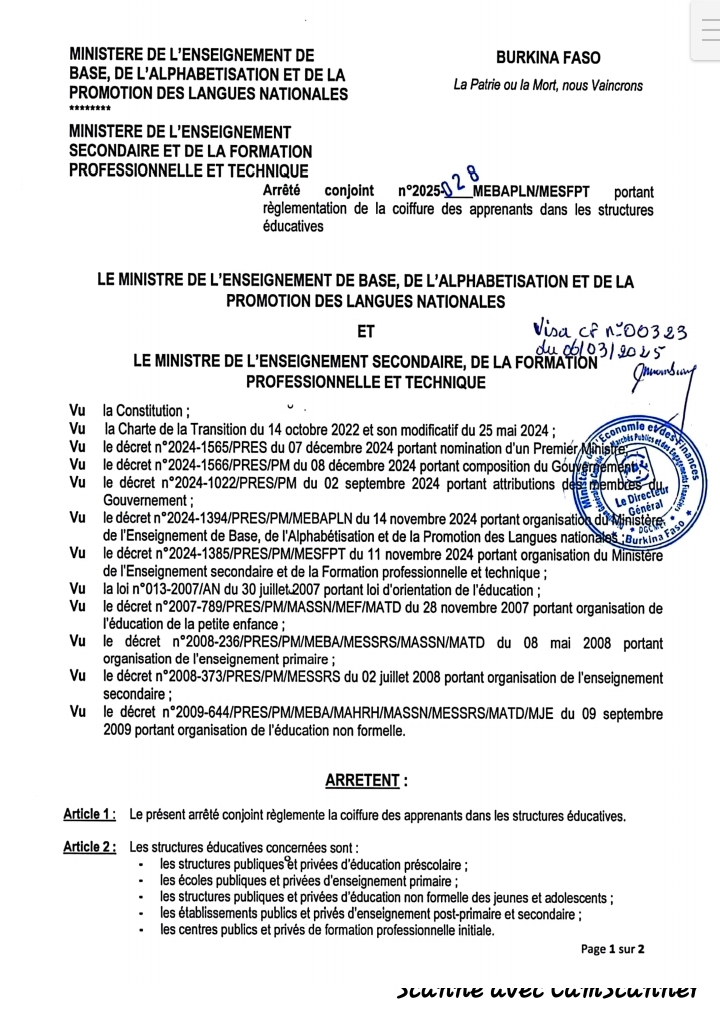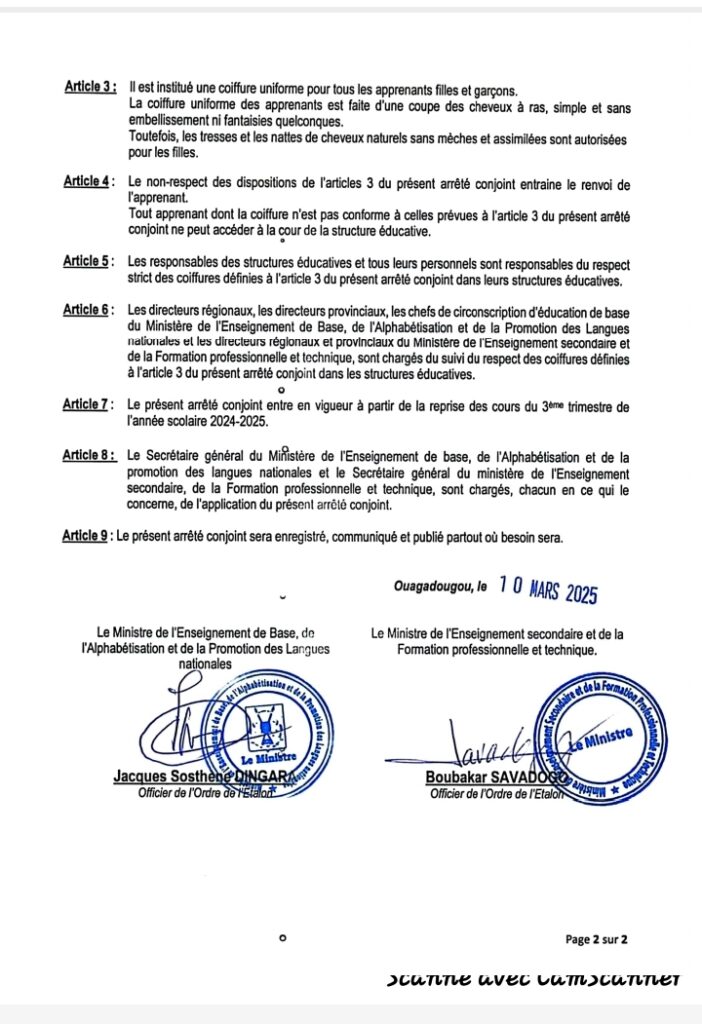 Au Burkina Faso, les coupes de cheveux fantaisistes sont désormais interdites dans les écoles. Cette mesure radicale, prise par le ministère de l’Enseignement de Base et celui en charge de l’Enseignement Secondaire, a été officialisée par un arrêté conjoint en date du 6 mars 2025. L’objectif affiché : imposer une coiffure uniforme et sobre aux apprenants dans les établissements scolaires du pays.