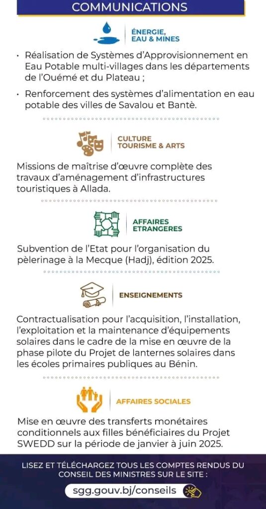 Conseil des ministres : Les grandes décisions prises ce jour ActualitéPolitique Par Le Potentiel Le 12 Mar 2025 0 2 320 Partager Le conseil des ministres s’est réuni ce mercredi 12 mars 2025 en présence du chef de l’État Patrice Talon. Plusieurs décisions ont été prises. Les grandes lignes. Articles Relatifs Transmission à l’Assemblée nationale d’un projet de loi sur… Oct 24, 2025 Conférence sur le commerce International des espèces de la… Oct 8, 2025 Conseil des ministres: Emploi, feu vert au plan stratégique… Sep 24, 2025 Conseil des ministres de ce mercredi 10 septembre 2025 :… Sep 10, 2025 Conseil des ministres : Voici les grandes prises ce mercredi… Sep 10, 2025 Conseil des ministresConseil des ministres décisionsConseil des ministres nominations 0 2 320 Partager