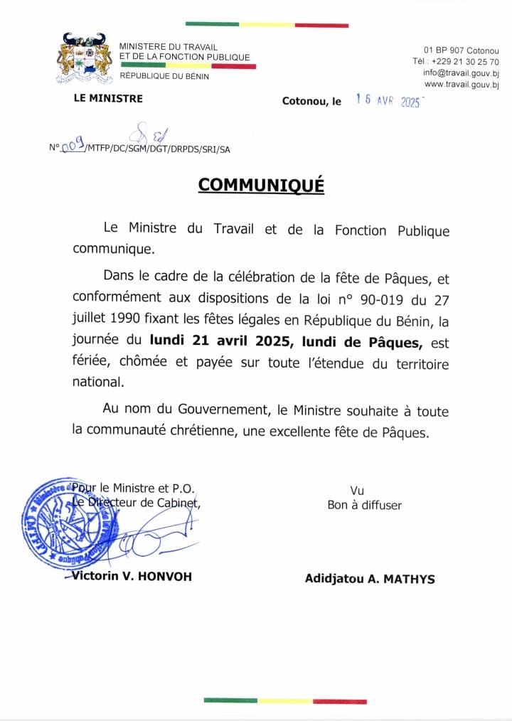 Le lundi 21 avril 2025 est officiellement déclaré jour férié, chômé et payé sur toute l’étendue du territoire national du Bénin, à l’occasion du lundi de Pâques, célébration importante pour la communauté chrétienne.