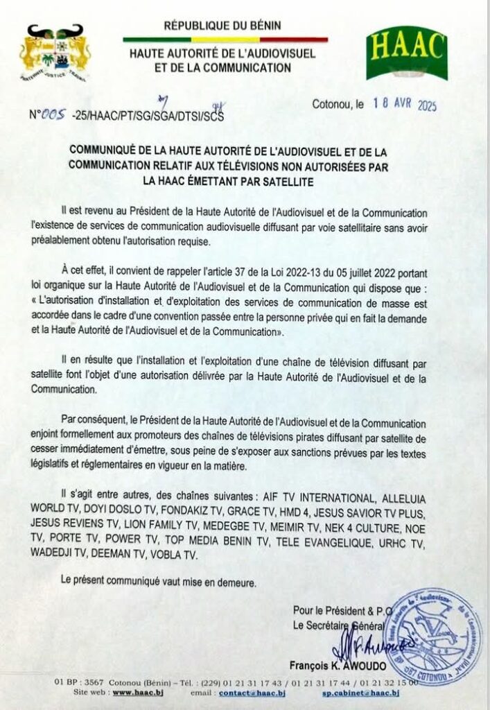 La Haute Autorité de l’Audiovisuel et de la Communication (HAAC) du Bénin passe à l’offensive contre la diffusion illégale de chaînes de télévision par satellite. Dans un communiqué officiel rendu public ce vendredi 18 avril 2025, l’institution de régulation met en demeure 22 chaînes émettant sans autorisation préalable, en violation flagrante des dispositions légales en vigueur.