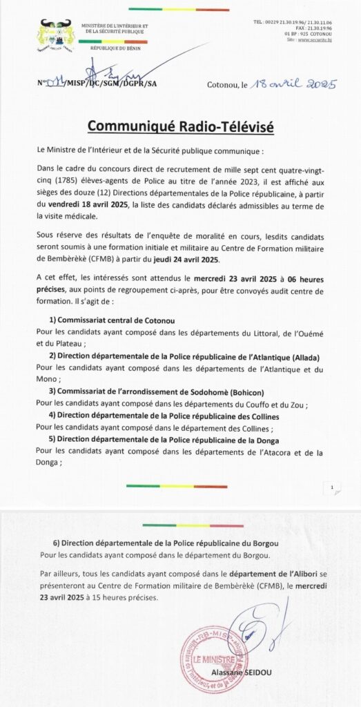 Cette publication a été faite par le ministre de l’Intérieur et de la Sécurité publique, Alassane Seidou, à travers un communiqué en date du 18 avril 2025. Sous réserve des résultats définitifs de l’enquête de moralité actuellement en cours, les candidats déclarés admissibles débuteront leur formation initiale et militaire au Centre de Formation Militaire de Bembèrèkè (CFMB) à partir du jeudi 24 avril 2025. Cette étape constitue une phase essentielle dans le processus d’intégration des futurs agents de la Police nationale.
