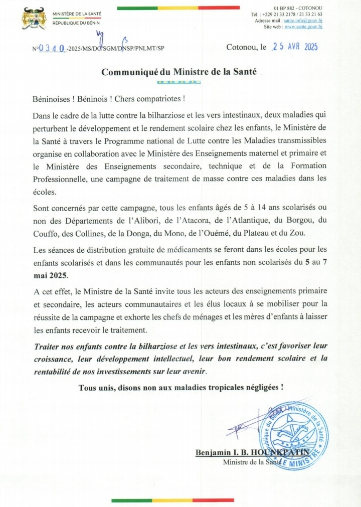 Le Ministère de la Santé, en collaboration avec les Ministères des Enseignements maternel, primaire, secondaire, technique et de la Formation professionnelle, organise une vaste campagne de traitement de masse dans les écoles, du 5 au 7 mai 2025. Objectif : renforcer la lutte contre la bilharziose et les vers intestinaux. L’annonce a été faite par voie de communiqué, signé par le ministre Benjamin Hounkpatin, en date du 25 avril 2025.