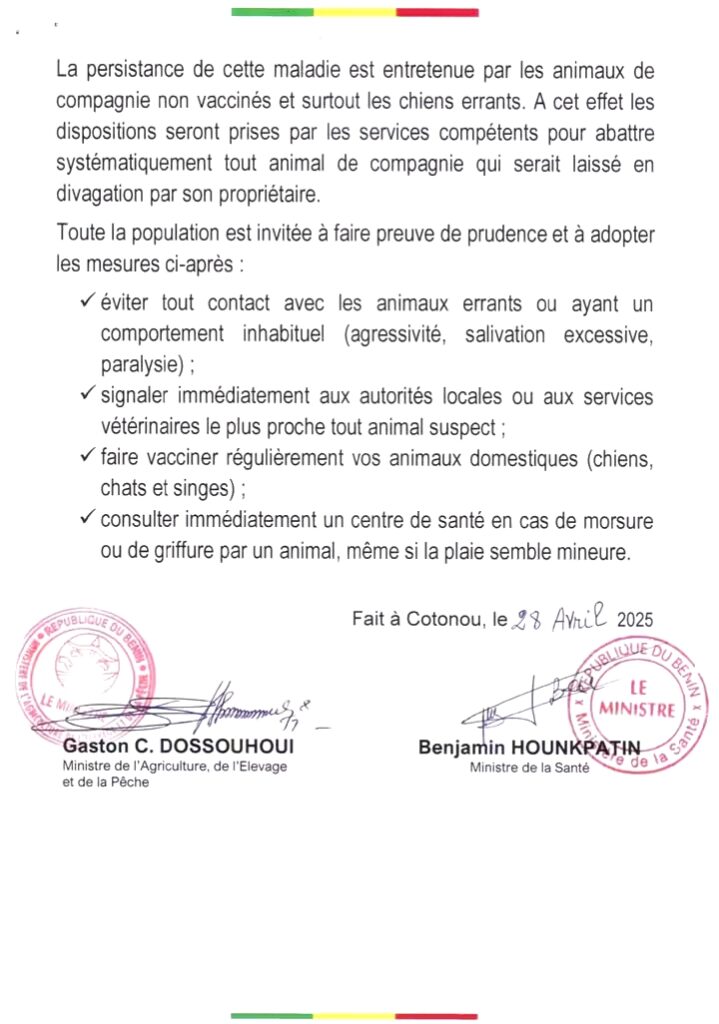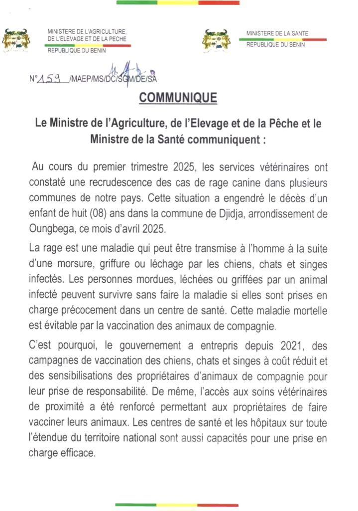 Le gouvernement béninois alerte sur une montée des cas de rage canine observée au cours du premier trimestre 2025. Un communiqué conjoint du ministre de la Santé et de celui de l’Agriculture, de l’Élevage et de la Pêche évoque une situation préoccupante dans plusieurs communes du pays.Un enfant de huit ans est décédé en avril à Oungbega, dans la commune de Djidja, après un contact avec un animal infecté.
