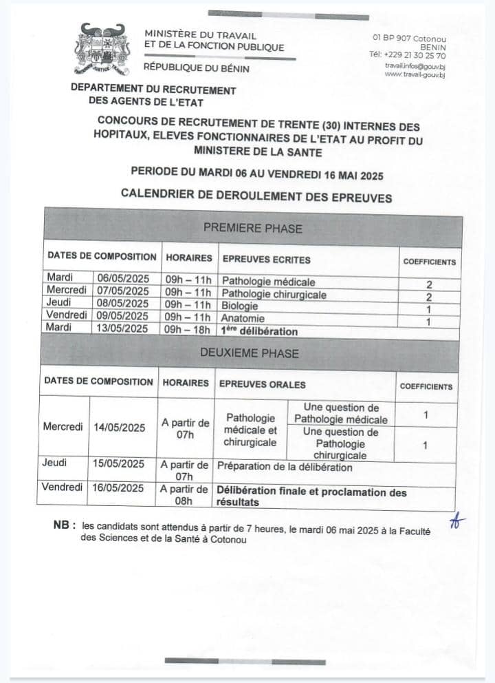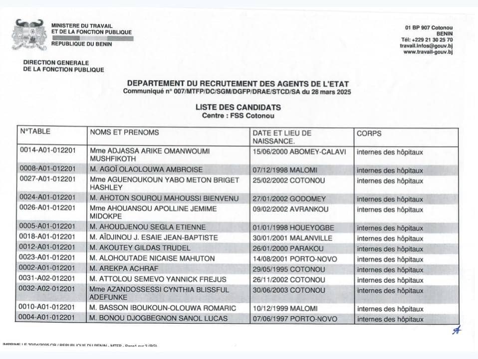 La liste officielle des candidats retenus ainsi que le calendrier détaillé des épreuves ont été publiés par le Ministère du Travail et de la Fonction Publique.