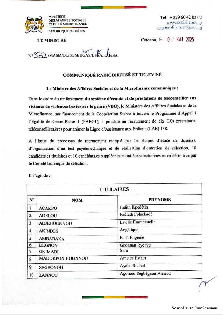 Le Ministère des Affaires Sociales et de la Microfinance du Bénin a procédé au recrutement de nouveaux téléconseillers pour renforcer la Ligne d’Assistance aux Enfants (LAE) via le numéro gratuit 138. Cette initiative s’inscrit dans le cadre du renforcement du système national d’écoute, d’orientation et de prise en charge des victimes de Violences Basées sur le Genre (VBG).