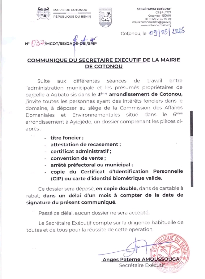 Face à la recrudescence d’individus se faisant passer pour des agents de la mairie afin de lever illégalement des suspensions de chantiers en construction, le Secrétaire Exécutif de la mairie de Cotonou tire la sonnette d’alarme.