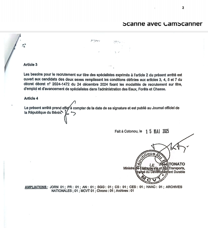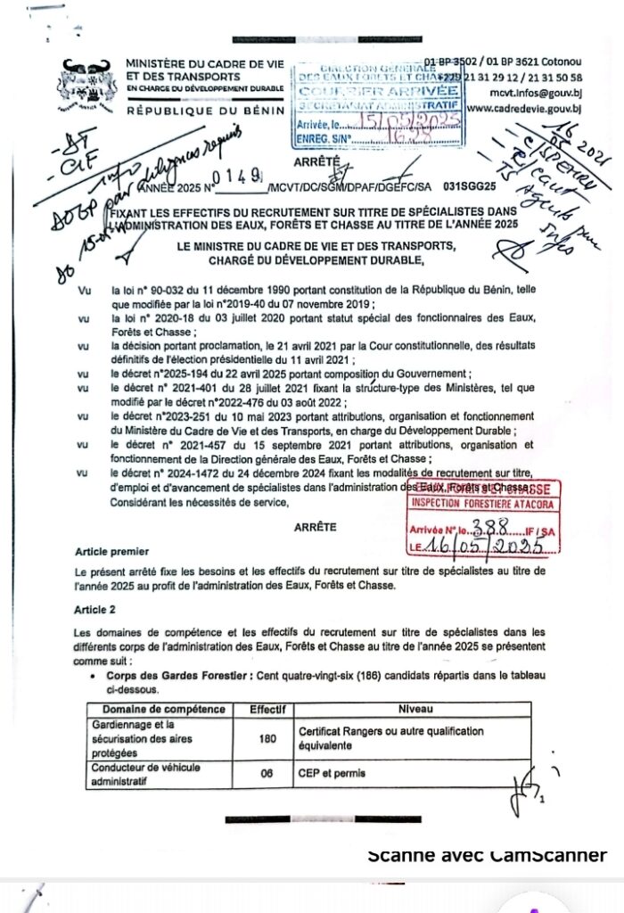 Le gouvernement béninois passe à l’offensive pour mieux encadrer la gestion de ses ressources naturelles. Un arrêté ministériel en date du 15 mai 2025, signé par José Tonato, ministre du Cadre de vie et des Transports en charge du Développement durable, fixe les quotas de recrutement sur titre dans les corps des Eaux, Forêts et Chasse. Au total, 221 postes sont ouverts cette année.