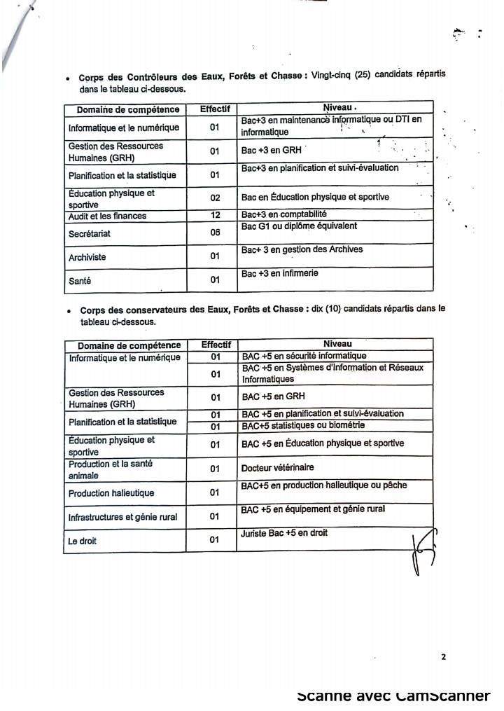 D’après l’arrêté N°0149/MCVT/DC/SGM/DPAF/DGEFC/SA, le recrutement se répartit comme suit : 186 gardes forestiers dans plusieurs spécialités , 25 contrôleurs, et 10 conservateurs. Ce nouveau contingent vient renforcer les capacités opérationnelles des services dédiés à la gestion durable des ressources forestières, de la faune et de la chasse.