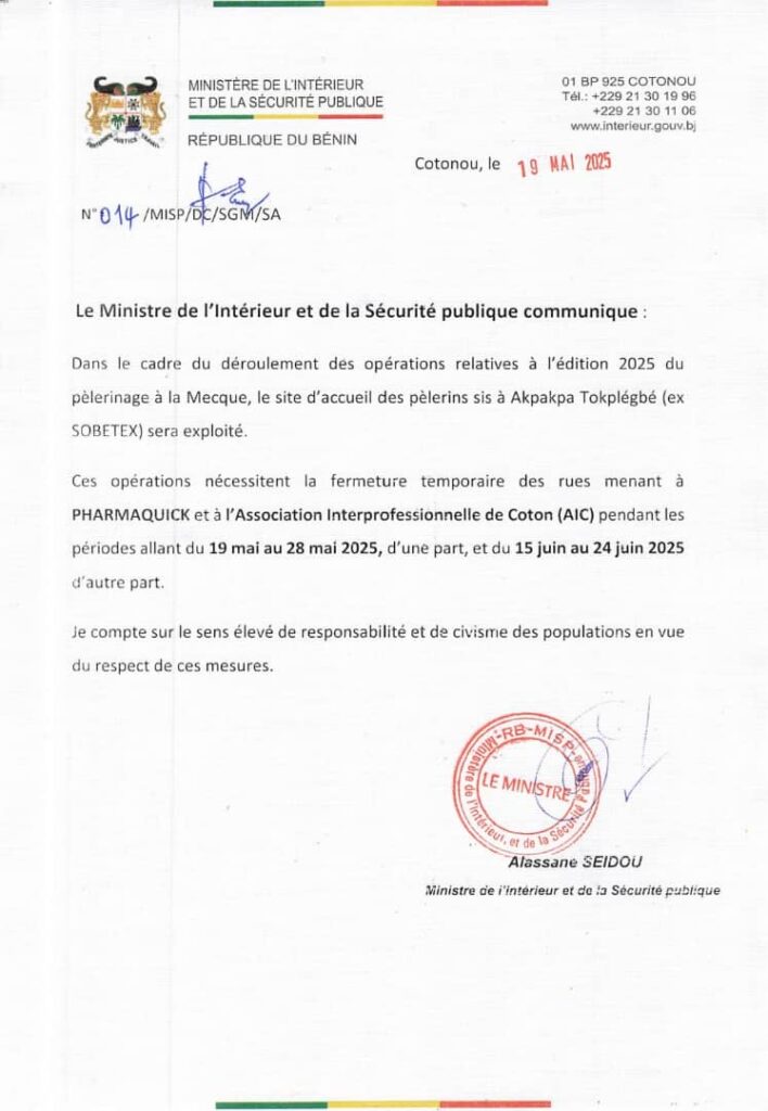 Dans le cadre de l’organisation du pèlerinage à la Mecque, édition 2025, le Ministère de l’Intérieur et de la Sécurité publique informe les populations des dispositions logistiques prises pour encadrer le départ des pèlerins depuis le site d’Akpakpa Tokplégbé (ancien SOBETEX).À cet effet, certaines rues donnant accès aux environs de PHARMAQUICK et de l’Association Interprofessionnelle de Coton (AIC) seront temporairement fermées à la circulation du 19 au 28 mai, puis du 15 au 24 juin 2025.