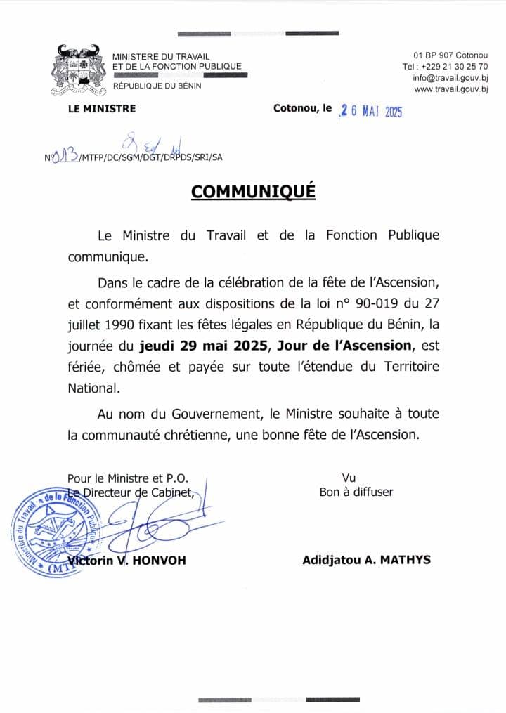Le Ministère du Travail et de la Fonction Publique a annoncé, par un communiqué en date du lundi 26 mai 2025, que la journée du jeudi 29 mai 2025 est déclarée fériée, chômée et payée sur toute l’étendue du territoire national.