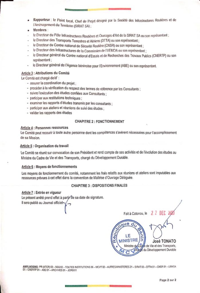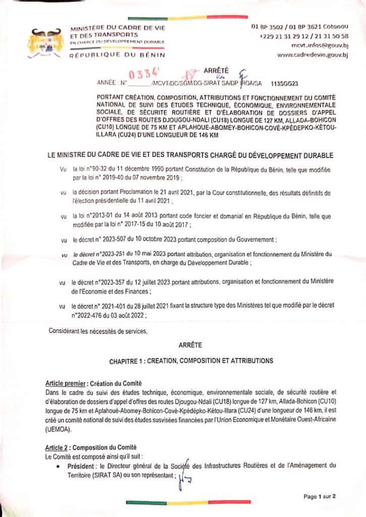 Ce comité a été institué par l’arrêté ministériel N°0334/MCVT/DC/SGM/DG-SIRAT SA/DPIROA/SA en date du 22 décembre 2023, signé par José Tonato, ministre du Cadre de vie et des Transports. Il est chargé de coordonner l’ensemble du processus d’études relatif aux axes routiers concernés. Ses missions incluent notamment : la vérification du respect des termes de référence par les bureaux d’études, le suivi de l’exécution des études confiées aux consultants, la participation aux restitutions techniques, l’examen et la validation des rapports transmis, la participation aux ateliers et réunions de suivi.