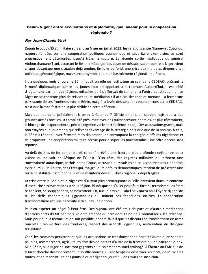 Au cœur du blocage : le pétrole nigérien, dont l’acheminement dépend d’infrastructures béninoises, mais aussi les accusations de collusion entre Cotonou et des puissances étrangères un discours alimenté par la junte au pouvoir à Niamey. Pour Yevi, ces postures entretiennent un climat de suspicion généralisée, au détriment des populations et des intérêts communs.