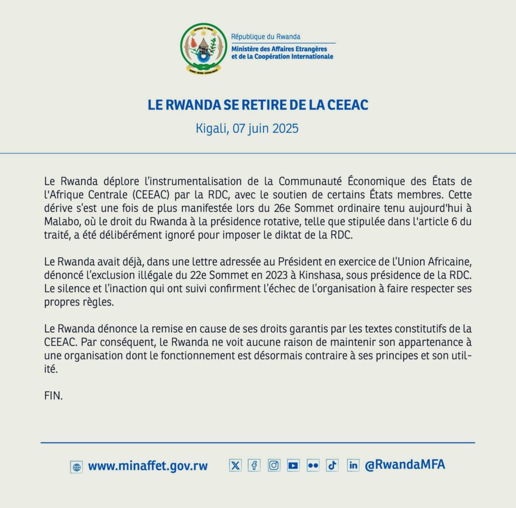 Le Rwanda a annoncé son retrait de la Communauté Économique des États de l’Afrique Centrale (CEEAC), accusant l’organisation d’être instrumentalisée politiquement au profit de la République Démocratique du Congo (RDC), avec la complicité tacite de certains États membres.