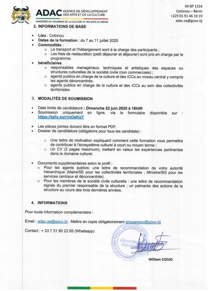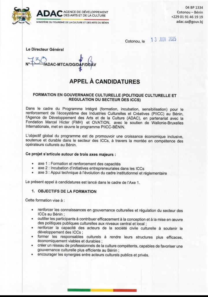 L’Agence de Développement des Arts et de la Culture (ADAC), la Fondation Marcel Hicter et Ovation, soutenues par Wallonie‑Bruxelles Internationale, lancent la formation intensive sur la « Gouvernance culturelle : politique culturelle et régulation des ICC ». Objectif , booster une croissance inclusive et durable des Industries culturelles et créatives (ICC) au Bénin en musclant les compétences des opérateurs culturels. L’annonce a été faite par William Codjo à travers un communiqué en date du 13 juin 2025.
