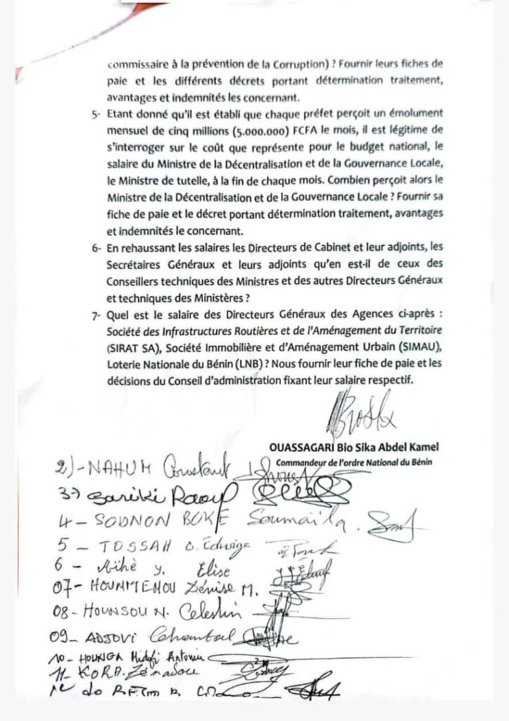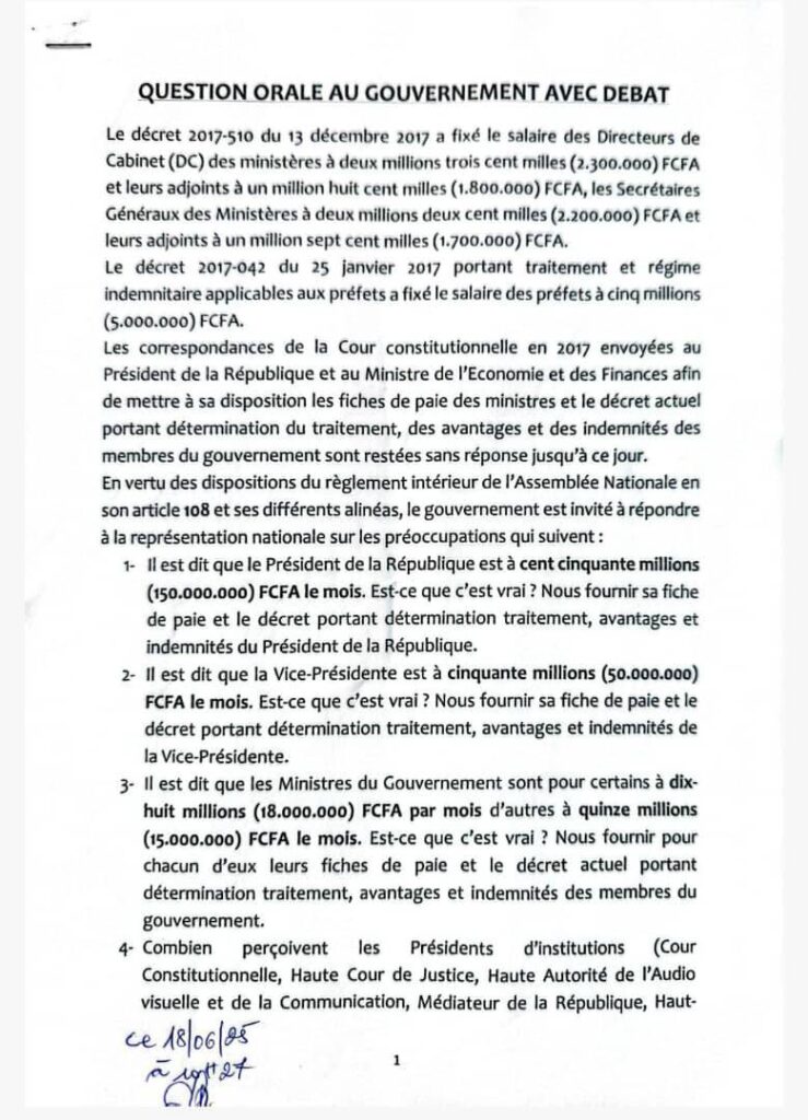 Cette initiative s’inscrit dans une démarche de transparence dans la gestion des ressources publiques. En plus des deux plus hautes autorités de l’exécutif, les parlementaires demandent également des informations sur les rémunérations des présidents des institutions de la République. Sont également visés certains directeurs généraux, notamment ceux de la SIRAT (Société des Infrastructures Routières et de l’Aménagement du Territoire), de la SIMUA (Société Immobilière et d’Aménagement Urbain), et de la Loterie Nationale du Bénin (LNB).