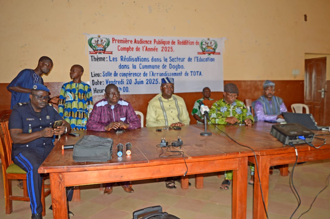 Ce vendredi 20 juin 2025, la salle de conférence de l’arrondissement de Tota a accueilli une séance pas comme les autres, une reddition de comptes centrée sur l’éducation. Le Maire Magloire Agossou, entouré de ses adjoints, des cadres techniques et élus locaux, est venu à la rencontre de ses administrés pour exposer, chiffres à l’appui, les efforts engagés pour améliorer les conditions de vie et de travail dans les écoles de la commune.