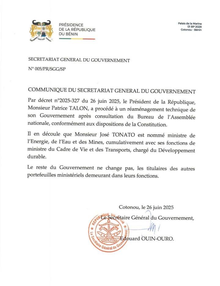 Par décret présidentiel en date du 26 juin 2025, le président de la République, Patrice Talon, a procédé à un réaménagement technique au sein du gouvernement. Cette réorganisation, effectuée après consultation du Bureau de l’Assemblée nationale, entraîne la nomination de José Tonato à la tête du ministère de l’Énergie, de l’Eau et des Mines, en plus de ses fonctions actuelles de ministre du Cadre de Vie et des Transports, chargé du Développement durable.