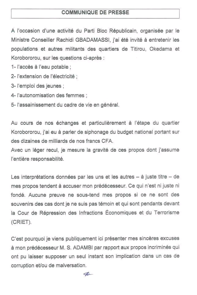 En évoquant des faits pendants devant la CRIET sans preuves concrètes ni implication directe, AKPONNA reconnaît avoir franchi une ligne rouge. Dans un mea culpa diffusé par voie de communiqué de presse, il prend l’entière responsabilité de ses déclarations, les qualifie d’ »erreur de communication » et va jusqu’à parler de « faute politique gravissime ».