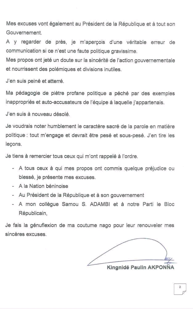 Dans un geste rare en politique béninoise, Paulin AKPONNA va au-delà du simple erratum. Il présente des excuses publiques formelles au Président de la République, à son gouvernement, à son collègue ADAMBI, à son parti le Bloc Républicain et à la Nation entière. Il le fait avec des mots forts, une génuflexion coutumière, et une reconnaissance explicite du poids des mots dans le champ politique.