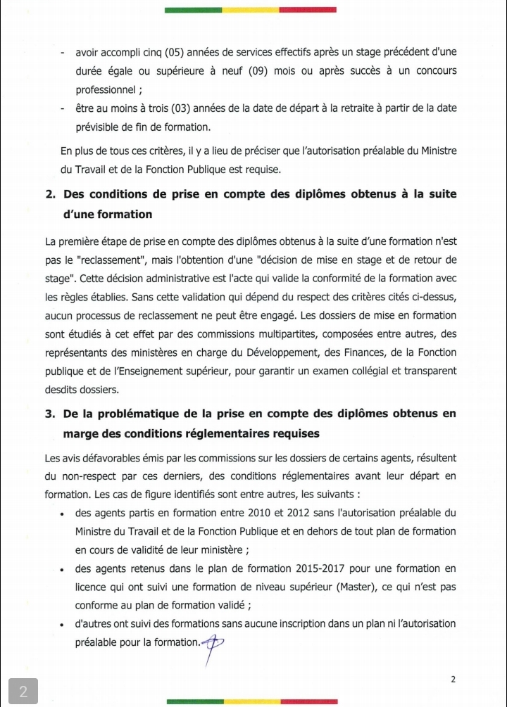 Le gouvernement serre la vis sur les reclassements automatiques des agents de l’État après des formations non autorisées. À travers un communiqué publié ce vendredi 11 juillet 2025, le Ministère du Travail et de la Fonction Publique rappelle que tout départ en formation continue doit être conforme aux textes réglementaires, sous peine de rejet des diplômes obtenus et du reclassement sollicité.