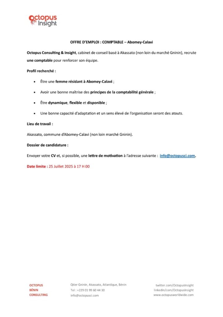 Opportunité professionnelle au Bénin: Octopus Consulting recrute une Comptable dynamique à Abomey-Calavi !