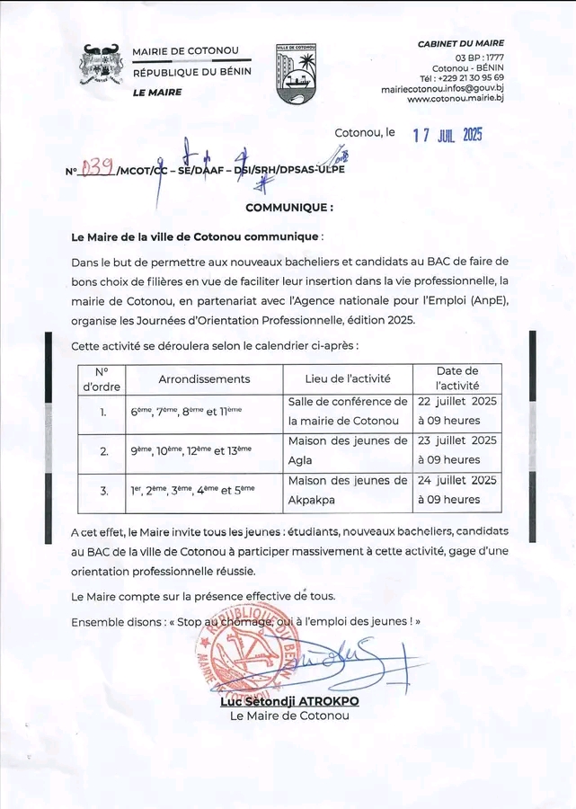 Dans une dynamique de lutte contre le chômage des jeunes, la Mairie de Cotonou, en collaboration avec l’Agence nationale pour l’Emploi (AnpE), organise du 22 au 24 juillet 2025 les Journées d’Orientation Professionnelle.