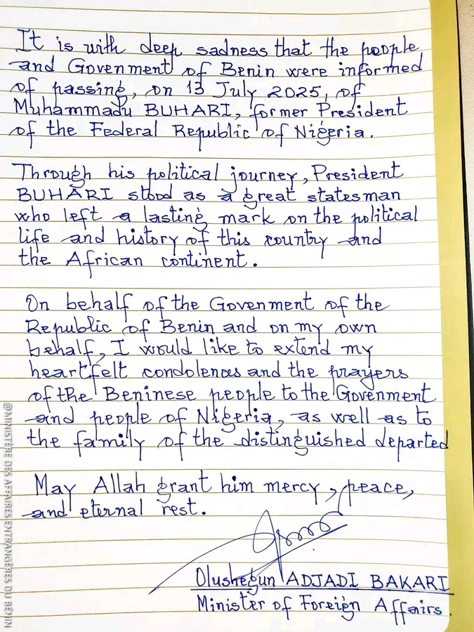 Dans un message empreint d’émotion et de respect, le chef de la diplomatie béninoise a salué la mémoire d’un dirigeant marquant de l’histoire contemporaine du continent. « Tout au long de son parcours politique, le Président Buhari s’est imposé comme un grand homme d’État qui a durablement marqué la vie politique de son pays ainsi que celle du continent africain. »