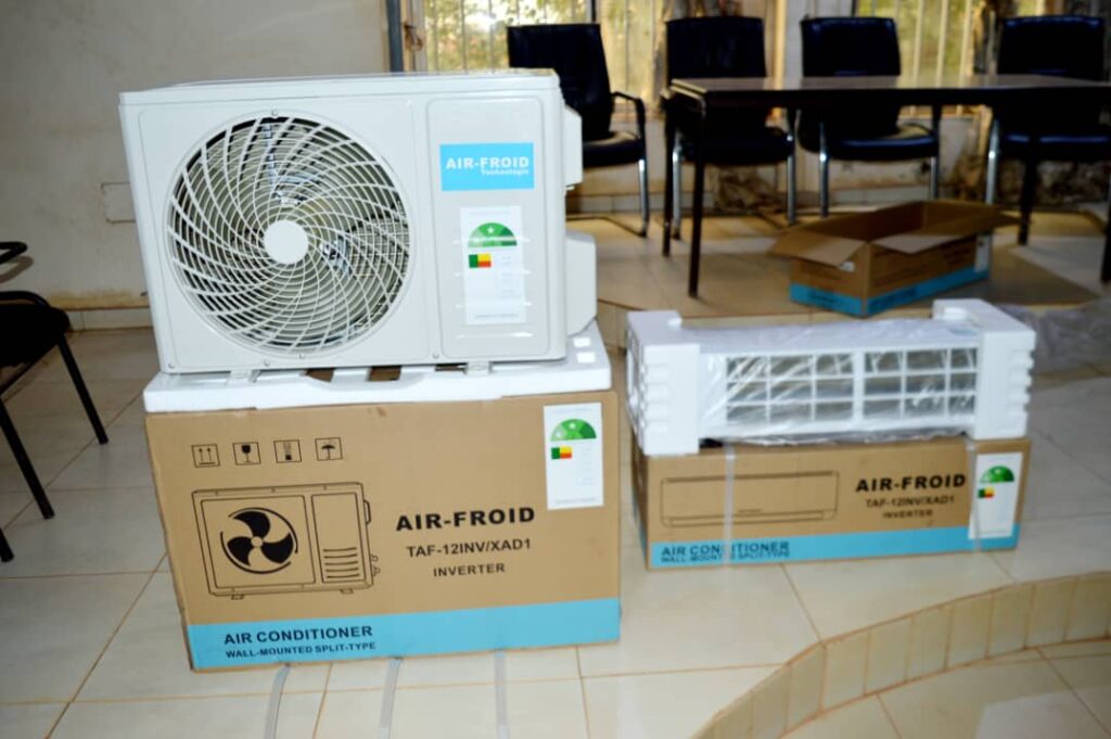 A Dogbo le jeudi 17 juillet 2025, la cour d’un service communal transformée en aire de réception. Plusieurs centaines de tables-bancs encore sous l’odeur du bois fraîchement scié. Des climatiseurs empilés, des meubles de bureau alignés. Le maire Magloire Agossou, entouré de ses collaborateurs, vient officiellement réceptionner le matériel.