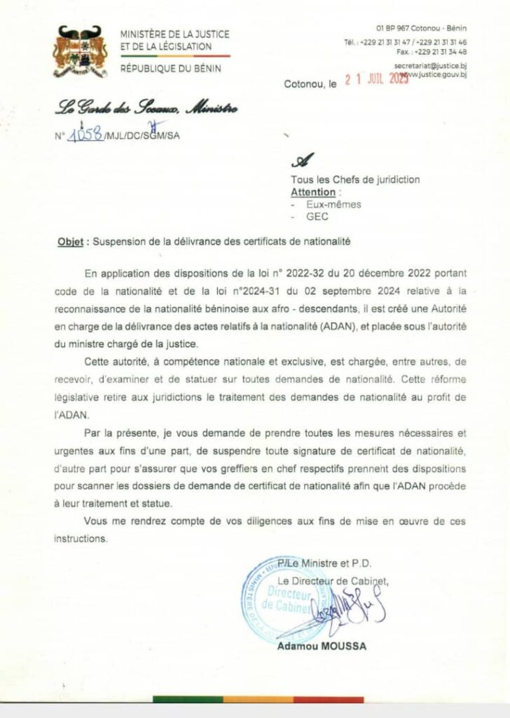 Le ministère de la Justice a ordonné à travers une note officielle en date du lundi 21 juillet 2025, la suspension immédiate de la délivrance des certificats de nationalité par les juridictions. Cette mesure s’inscrit dans le cadre de la mise en œuvre des réformes législatives récentes, notamment la loi n° 2022-32 du 20 décembre 2022 portant Code de la nationalité et la loi n° 2024-31 du 2 septembre 2024, relative à la reconnaissance de la nationalité béninoise aux afro-descendants.
