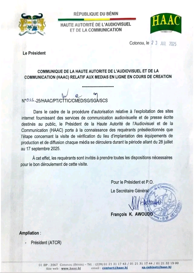 La Haute Autorité de l’Audiovisuel et de la Communication (HAAC) passe à l’action. Dans un communiqué officiel en date du 23 juillet 2025, l’institution de régulation des médias au Bénin informe les promoteurs de médias en ligne et de presse écrite présélectionnés qu’une opération de vérification de leurs équipements sera menée du 28 juillet au 17 septembre 2025.