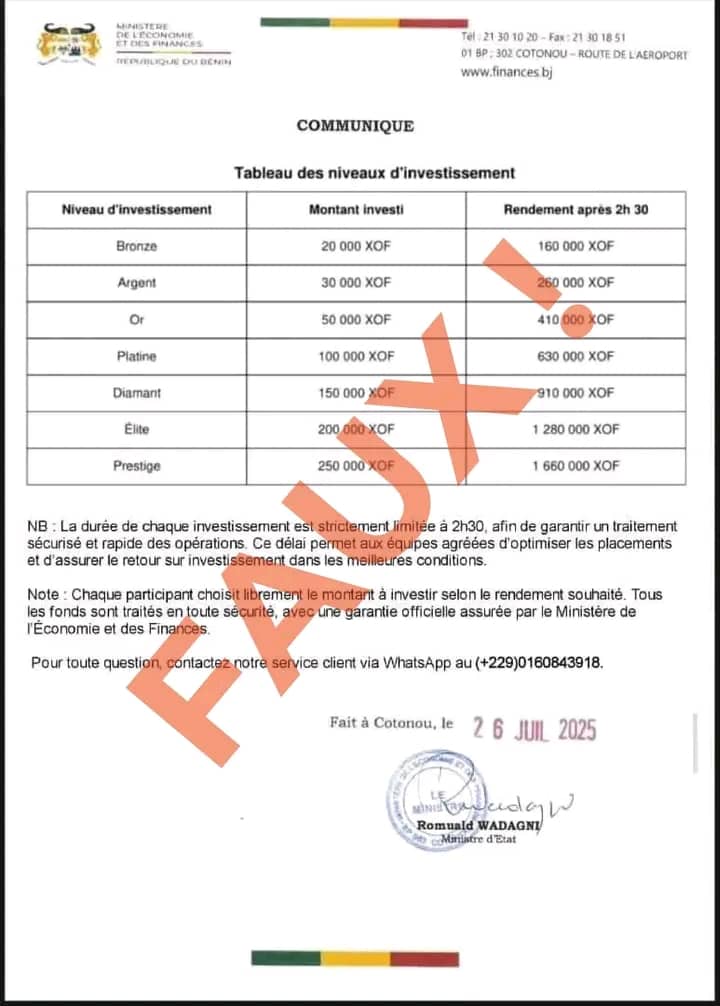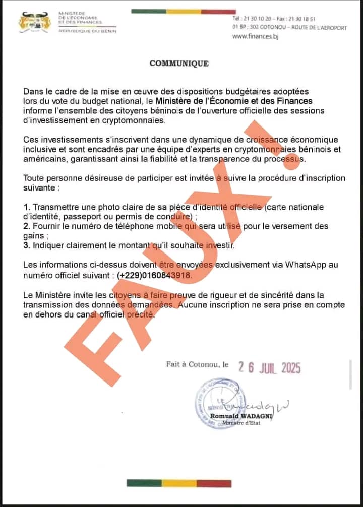 Le Centre national d’investigations numériques (CNIN) met en garde contre une nouvelle tentative d’arnaque circulant actuellement sur les réseaux sociaux au Bénin. Dans un communiqué publié ce lundi 28 juillet 2025, il appelle la population à la plus grande vigilance face à des documents frauduleux promouvant de supposées opportunités d’investissement en cryptomonnaie.