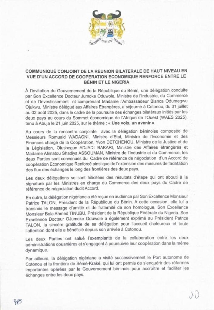 Reçue en audience par le président Patrice Talon, la partie nigériane a transmis un message de fraternité du président Bola Ahmed Tinubu. Les négociations officielles du futur accord économique débuteront en septembre 2025, avec l’ambition partagée de bâtir un partenariat commercial exemplaire en Afrique de l’Ouest.