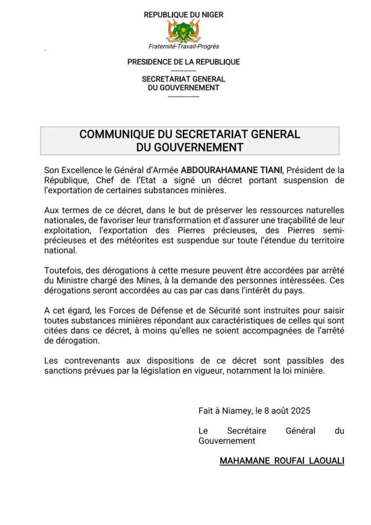 Dans une démarche ambitieuse visant à préserver ses richesses naturelles, le Président de la République, Son Excellence le Général d’Armée Abdourahamane Tiani, a signé un décret majeur suspendant l’exportation de certaines substances minières stratégiques.