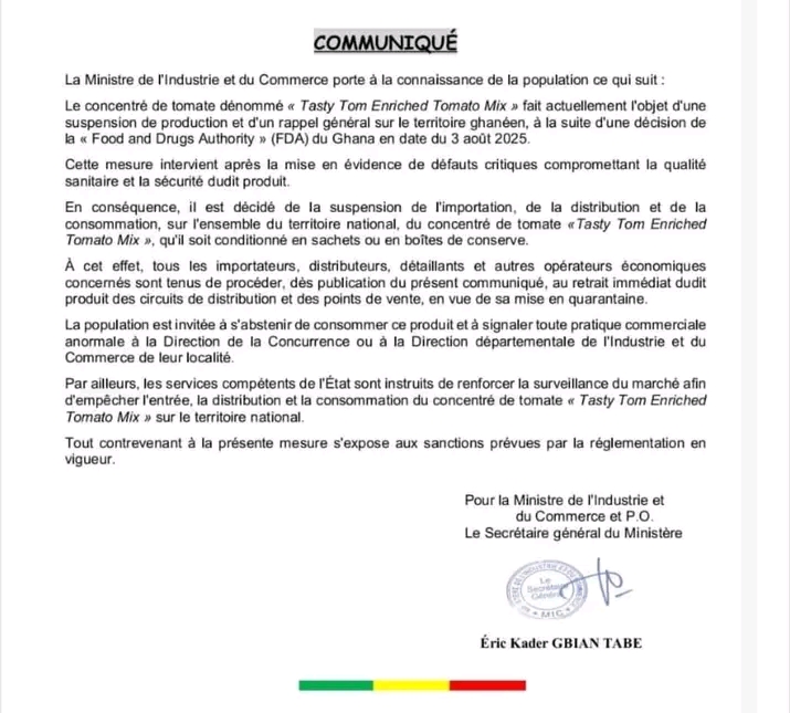 Le ministère béninois de l’Industrie et du Commerce a annoncé, ce lundi 11 août 2025 l’interdiction d’importer, de distribuer et de consommer le concentré de tomate «Tasty Tom Enriched Tomato Mix» sur l’ensemble du territoire national.