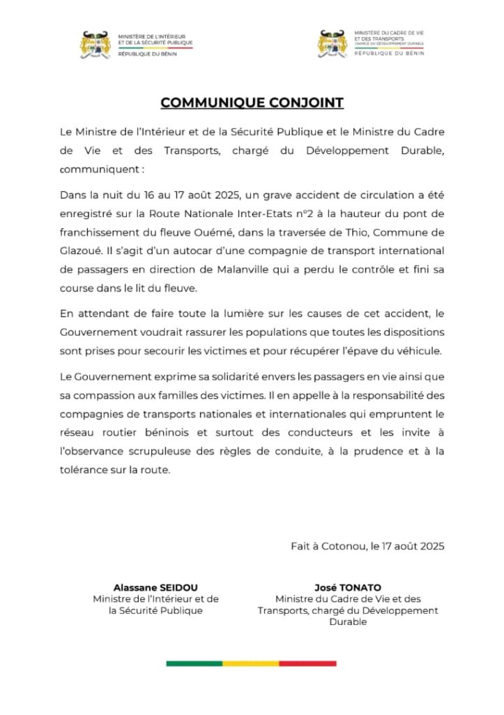 Un grave accident de circulation s’est produit dans la nuit du 16 au 17 août 2025 sur la Route Nationale Inter-États n°2, au niveau du pont de franchissement du fleuve Ouémé, dans la traversée de Thio, commune de Glazoué. Selon les premières informations, un autocar d’une compagnie de transport international, en partance pour Malanville, a perdu le contrôle avant de terminer sa course dans le lit du fleuve.