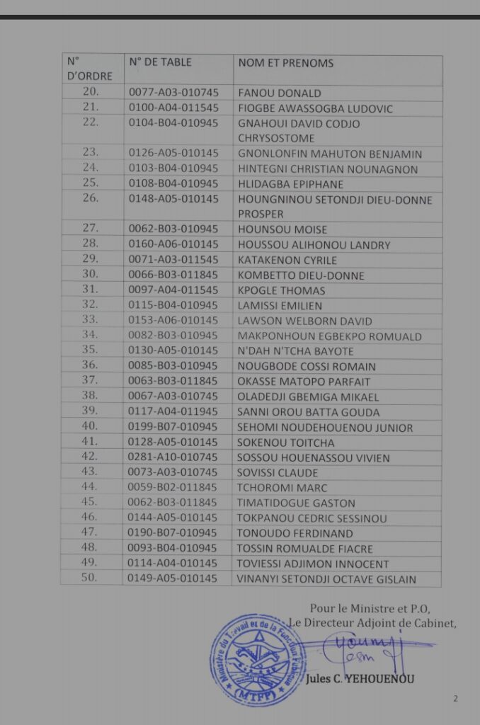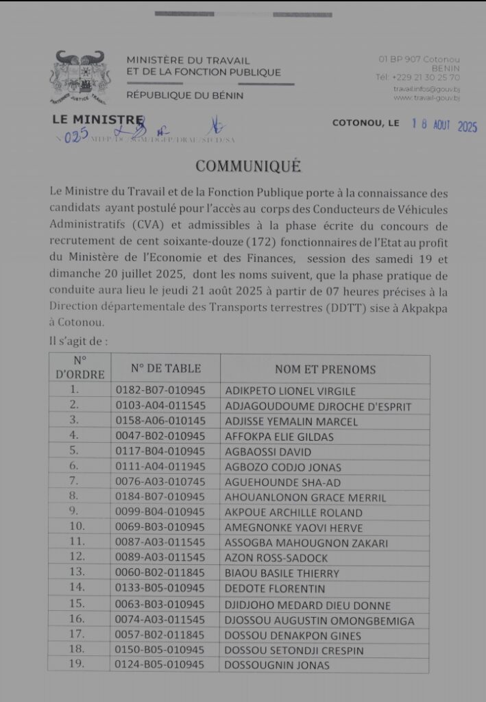 Les candidats au concours de recrutement au profit du ministère de l’économie et des finances sont convoqués pour la prochaine phase. Il s’agit des Conducteurs de Véhicules Administratifs (CVA), admis à la phase écrite du concours. La liste a été dévoilée ce lundi à travers un communiqué du Ministère du Travail et de la Fonction Publique. Les admis sont convoqués pour la phase pratique de conduite le jeudi 21 août 2025 à 07h00. L’épreuve se déroulera à la Direction Départementale des Transports Terrestres (DDTT) d’Akpakpa, à Cotonou.